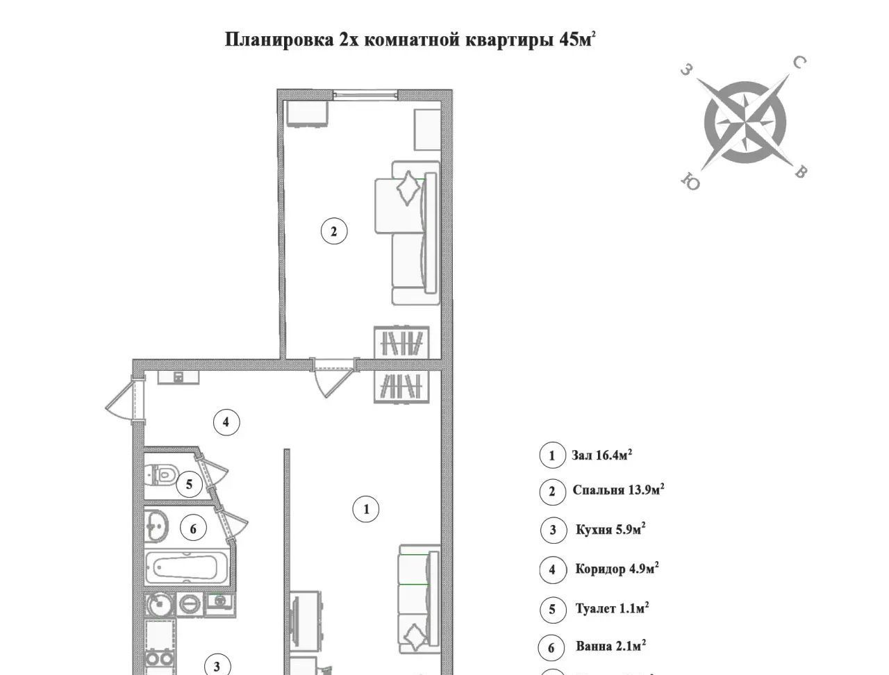 45 метров, которые встретят вас светом. Две комнаты — 14 и 16,5 метров.