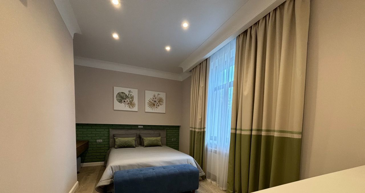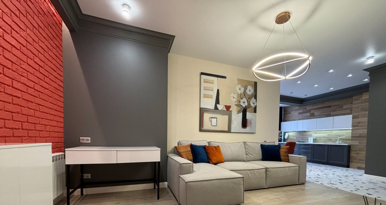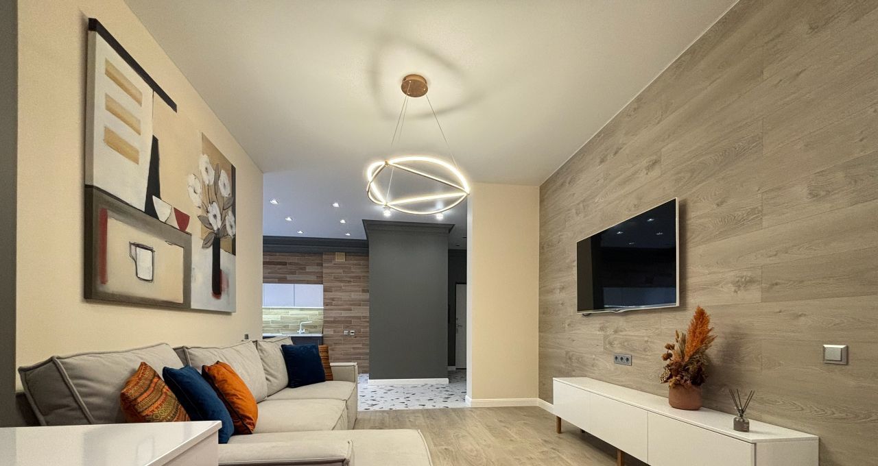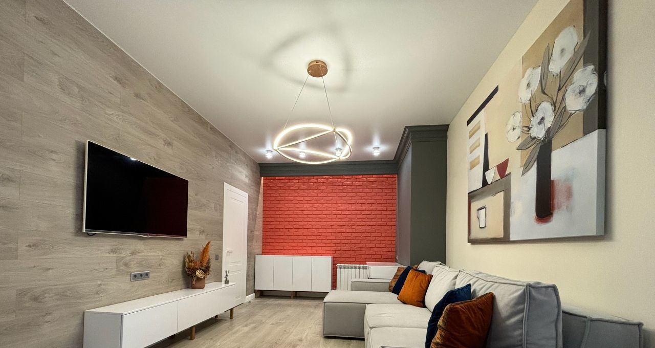 В квартире сделан современный ремонт, она полностью меблирована и готова к проживанию. Кухня оборудована всей необходимой техникой, включая холодильник и плиту. Просторная гостиная и спальня оформлены в светлых тонах, создавая атмосферу уюта и комфорта. Санузел раздельный и современно оборудован.