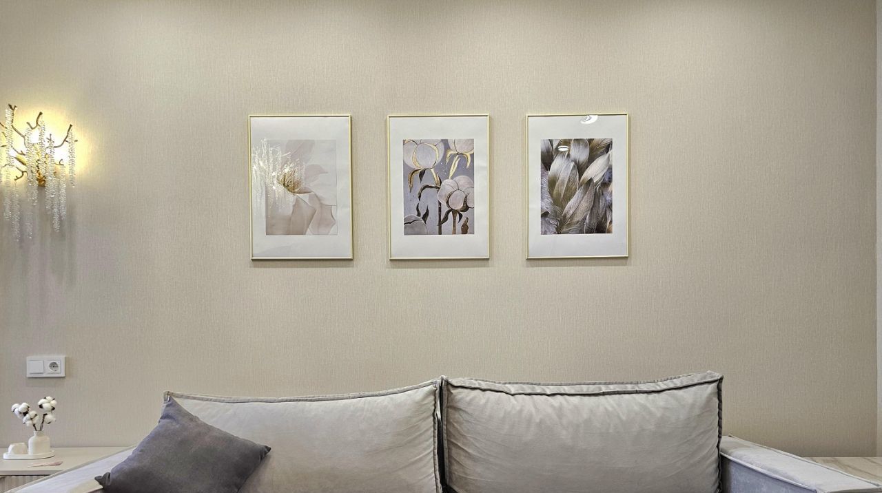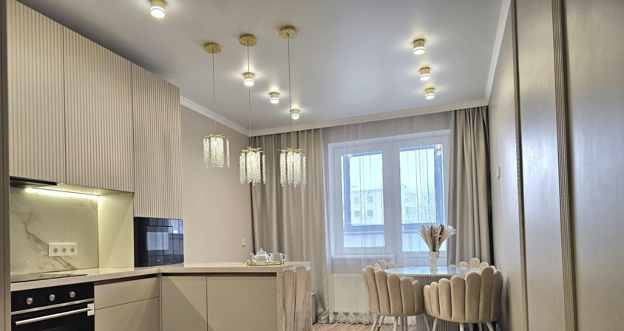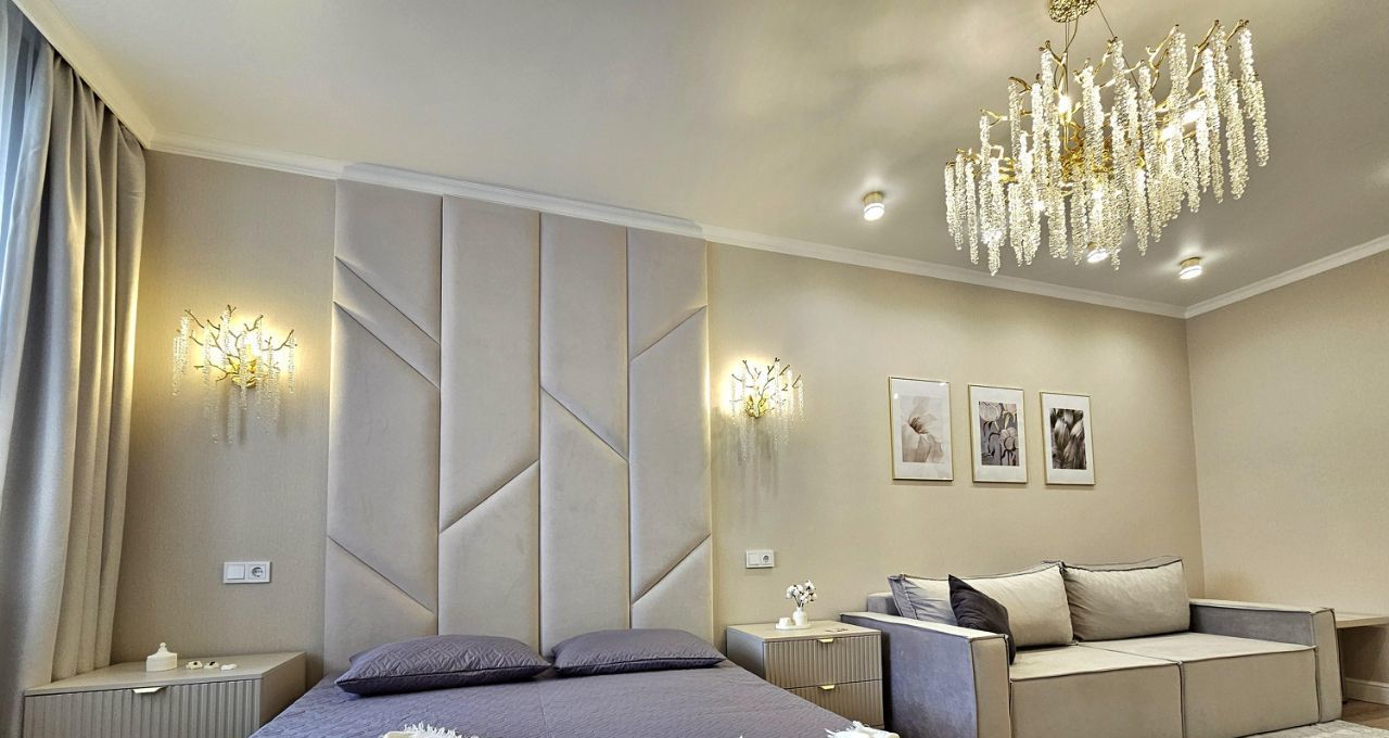 В гостиной установлен стильный диван и новый телевизор, а также современная люстра, создающая приятную атмосферу. Из окон открывается вид на тихий двор.
