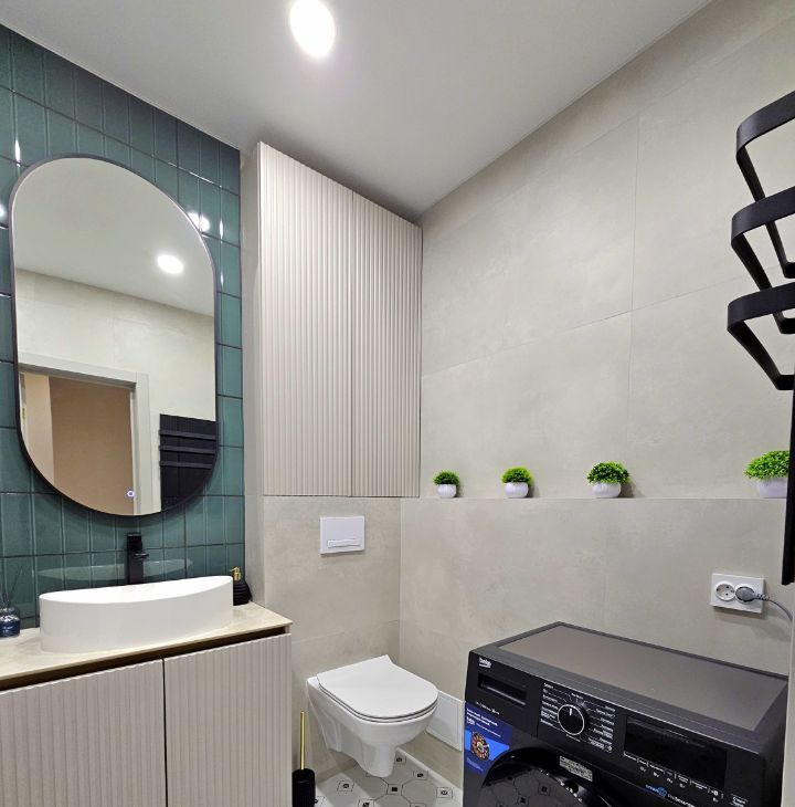Санузел совмещенный, оформлен в современном стиле с качественной сантехникой. Имеется новая стиральная машина.