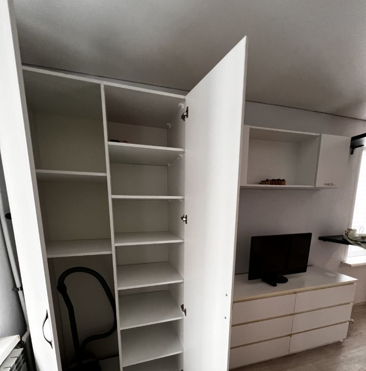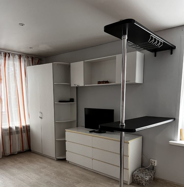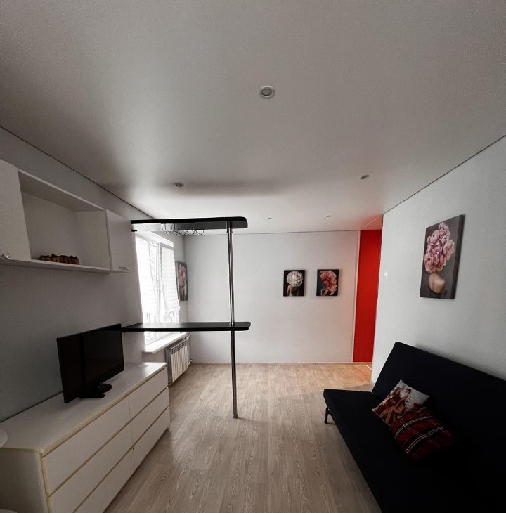 В гостиной установлен телевизор и шкафы для хранения вещей. Из мебели также имеются удобные диван и кровать.