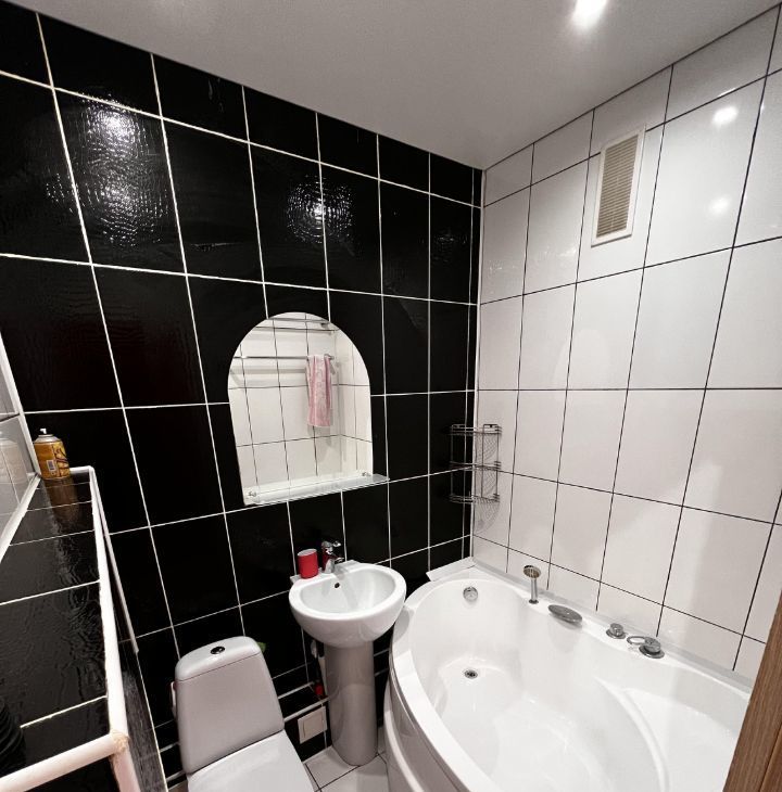 Ванная комната совмещенная, оформлена в современном стиле с качественной сантехникой. Балкон предоставляет дополнительное пространство для хранения.