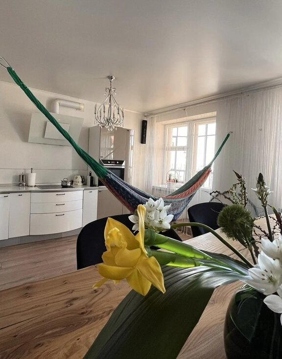 Из окон открывается ошеломляющая панорама. В гостиной можно растянуть гамак – для занятий йогой и расслабления в любое время дня.