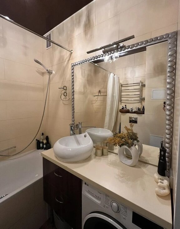 Потолки: матовые натяжные полотна. Сантехника: фаянс и чугунная ванна производства Испания.