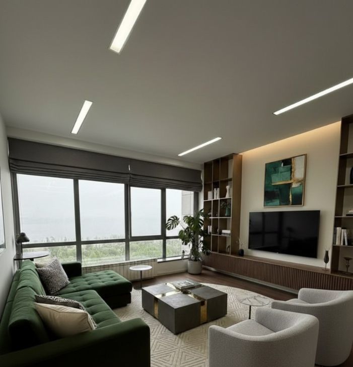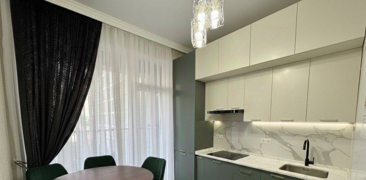 Квартира имеет дизайнерский ремонт и полностью меблирована. В кухне площадью 14 кв.м есть современная мебель, а также вся необходимая техника: холодильник, посудомоечная машина и кондиционер. В комнатах также предусмотрена мебель для комфортного проживания. Ванная комната оснащена как душевой кабиной, так и ванной, что подойдёт для любого настроения и потребностей.