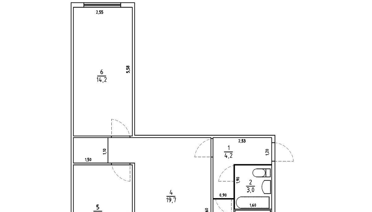Общая площадь 60 кв.м: кухня - 6 кв.м., комнаты: 20, 11 и 14 кв.м., совмещенный санузел. Есть застеклённый, обшитый деревом балкон.