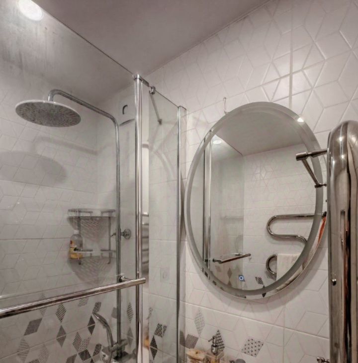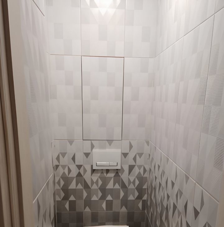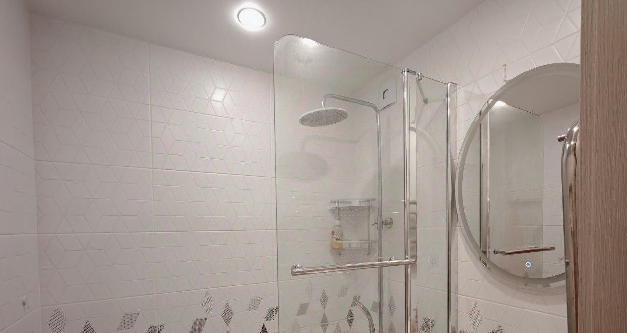 Ванная комната: ванна со стеклянной шторкой, тропический душ, стиральная машина, зеркало с подсветкой. Туалет: подвесной унитаз с инсталляцией. Стильная плитка с геометрическим рисунком.