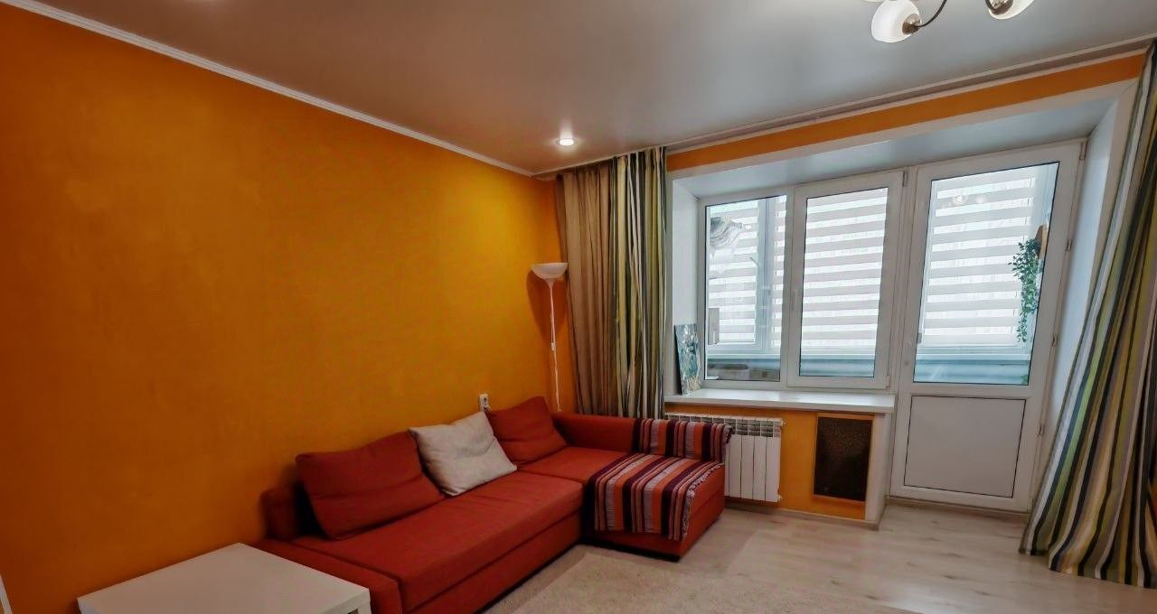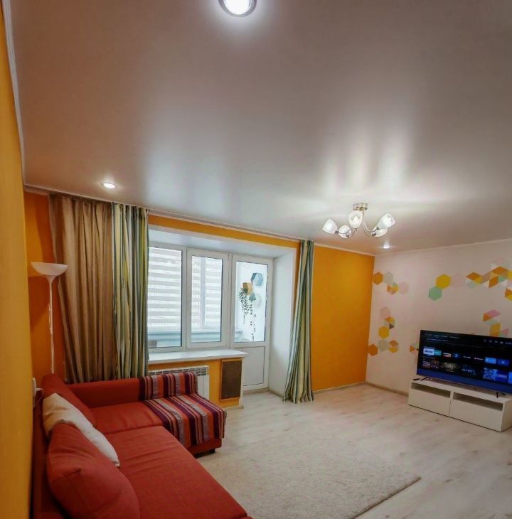 Просторная комната с ярким дизайном, раскладной диван, журнальный столик, тумба, большой телевизор. Выход на балкон(лоджия).