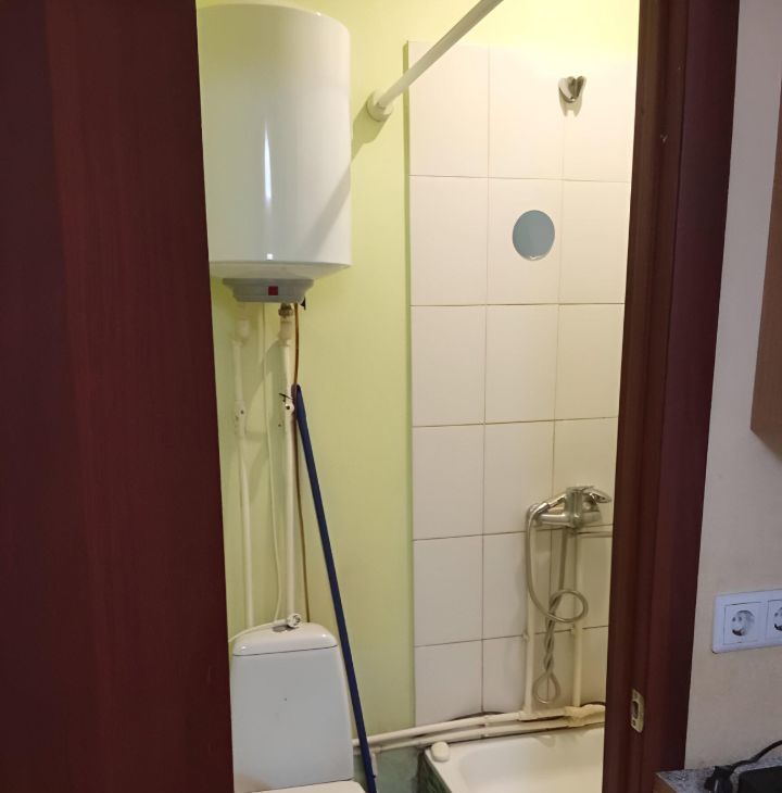 Одно спальное место- тахта, не раскладывается. Шкаф для одежды, стол, стулья, кухонный уголок, плитка для приготовления пищи, стиральная машинка.