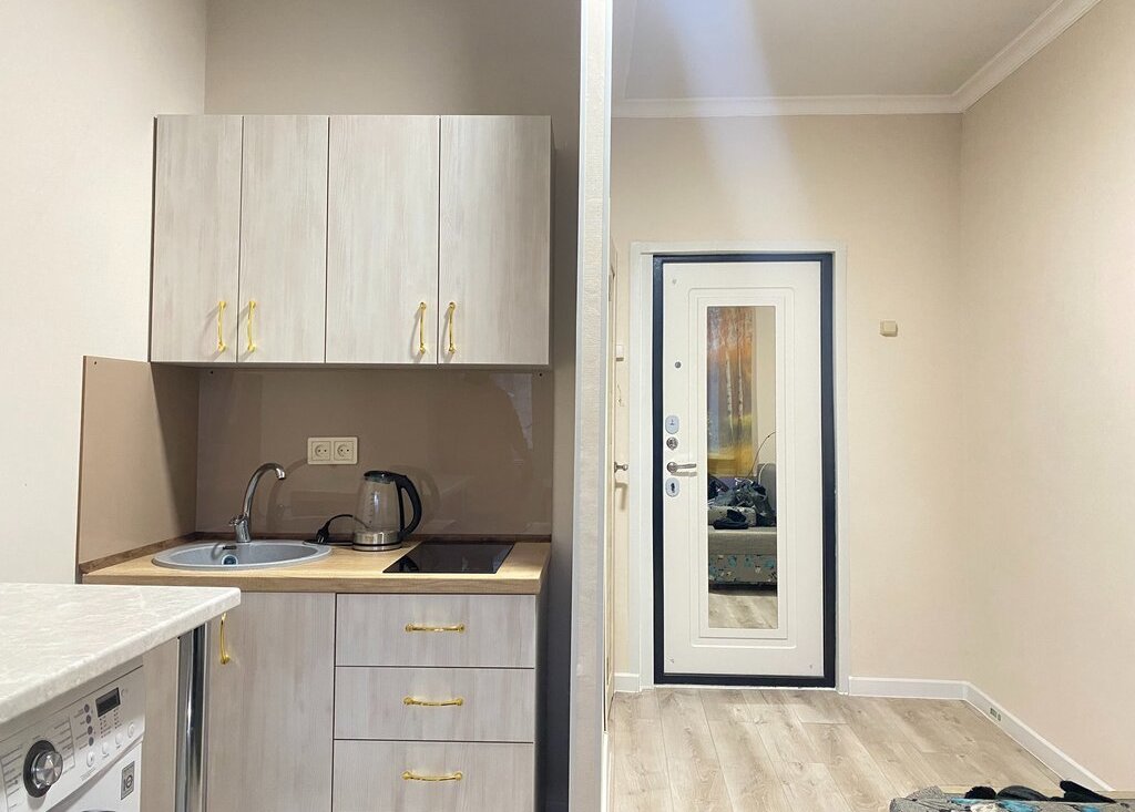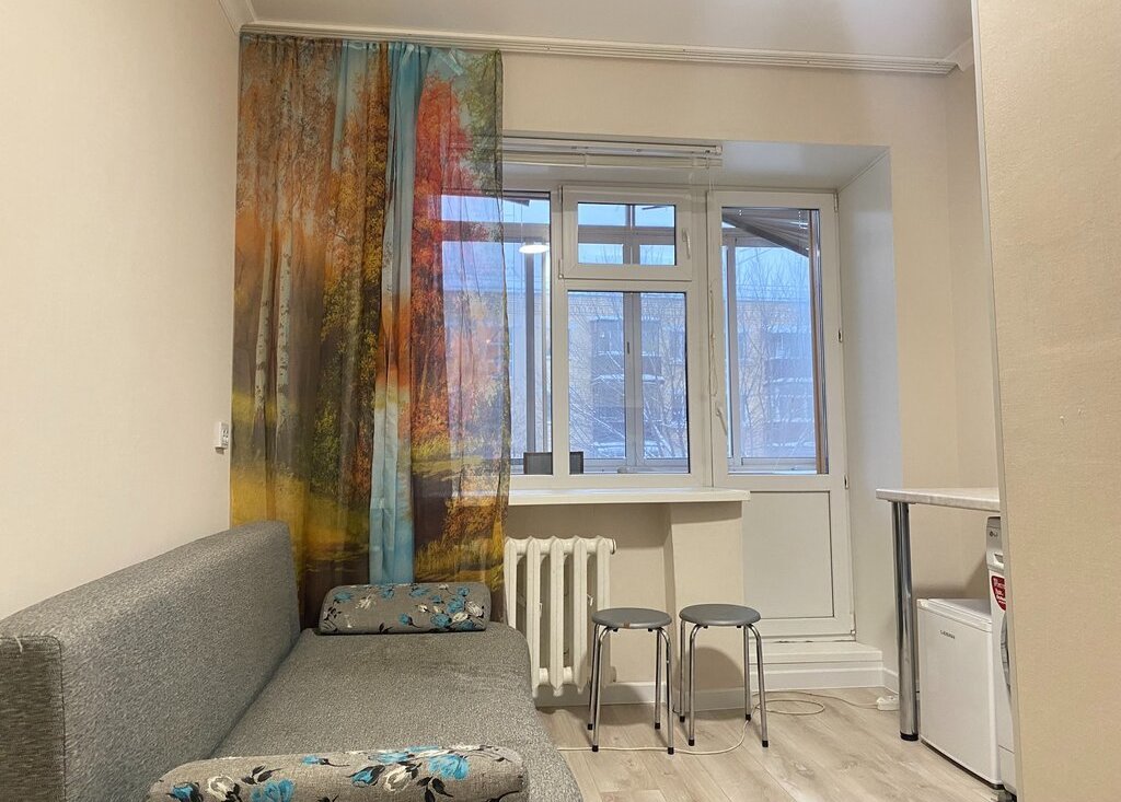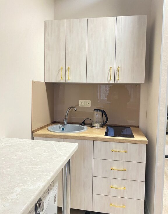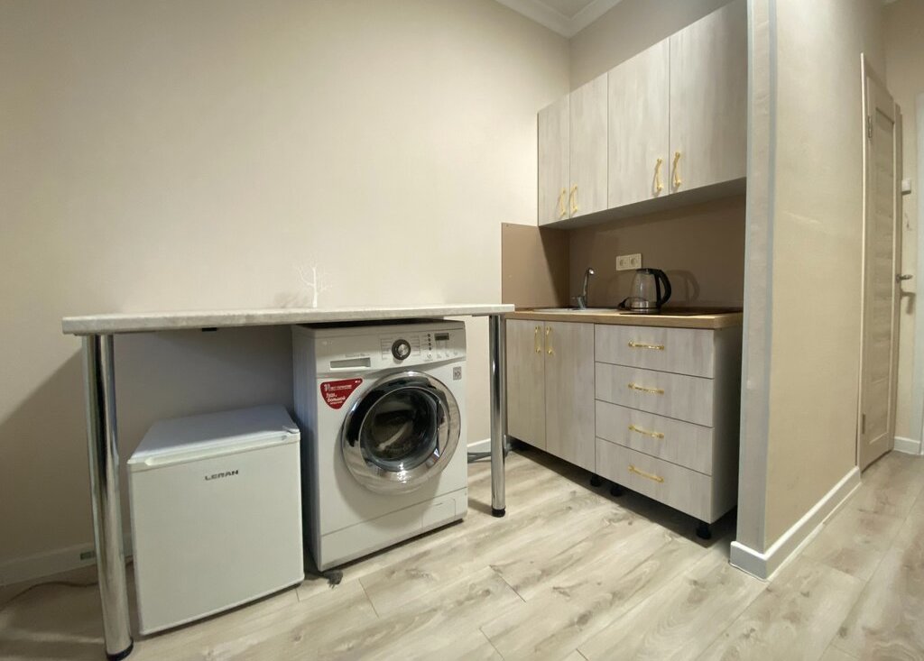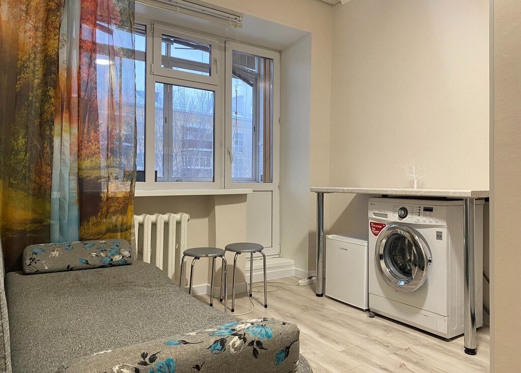 Здесь есть всё необходимое для комфортного проживания: мебель в комнате и на кухне, современный холодильник и стиральная машина. Санузел совмещённый, с душевой кабиной. Имеется свой собственный личный балкон