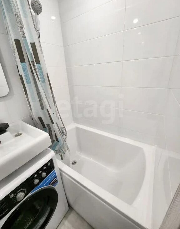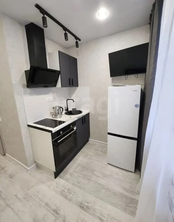 В студии установлена новая техника (холодильник, стиральная машина), новая мебель (кухня, диван)