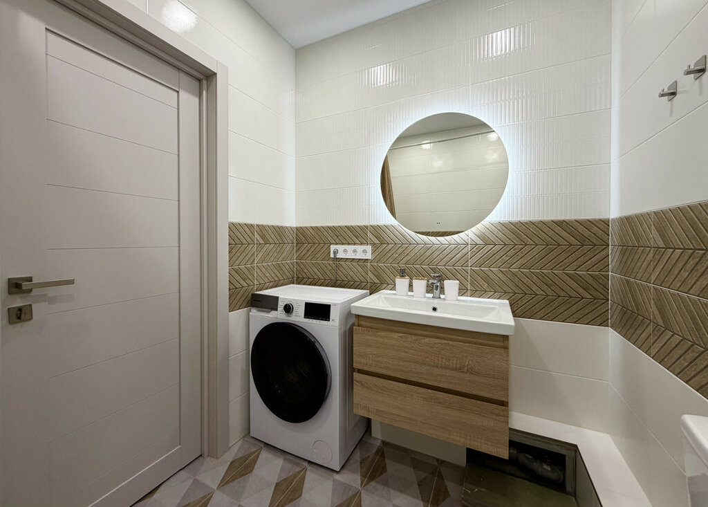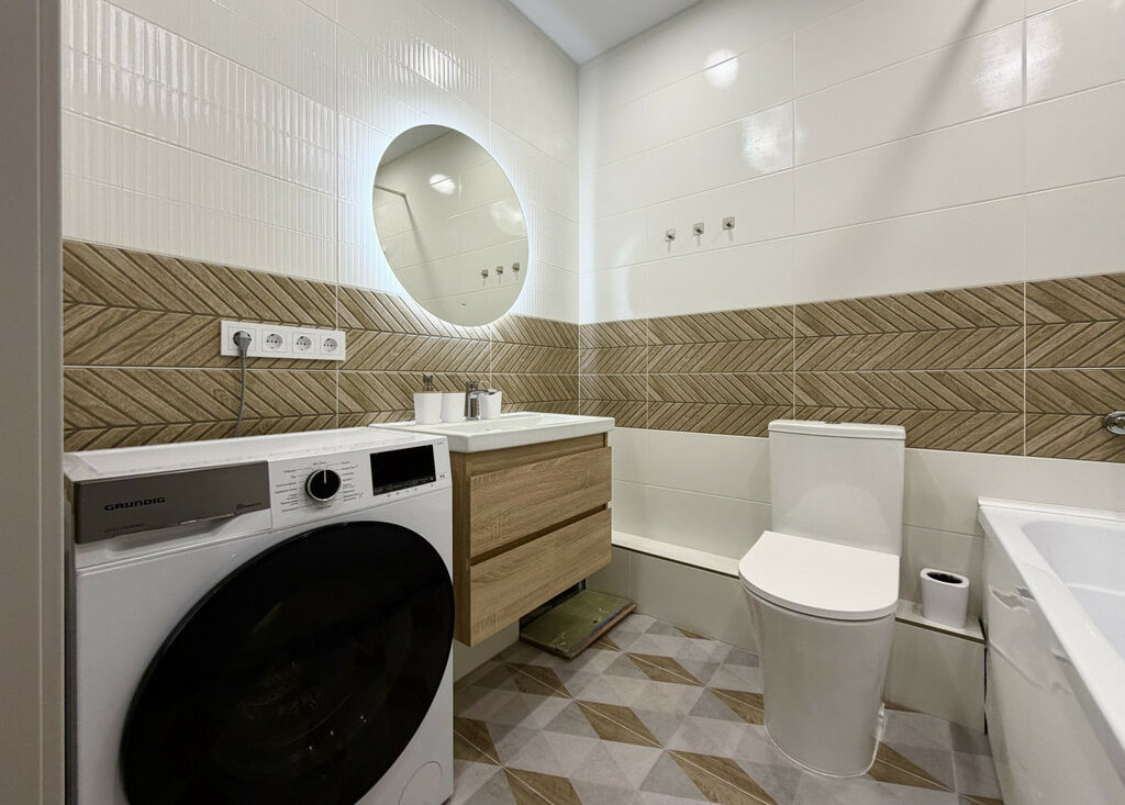 В квартире есть всё необходимое: большая кровать, диван, стиральная машина и вместительный шкаф!