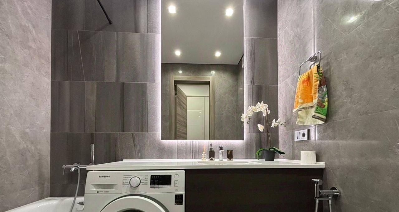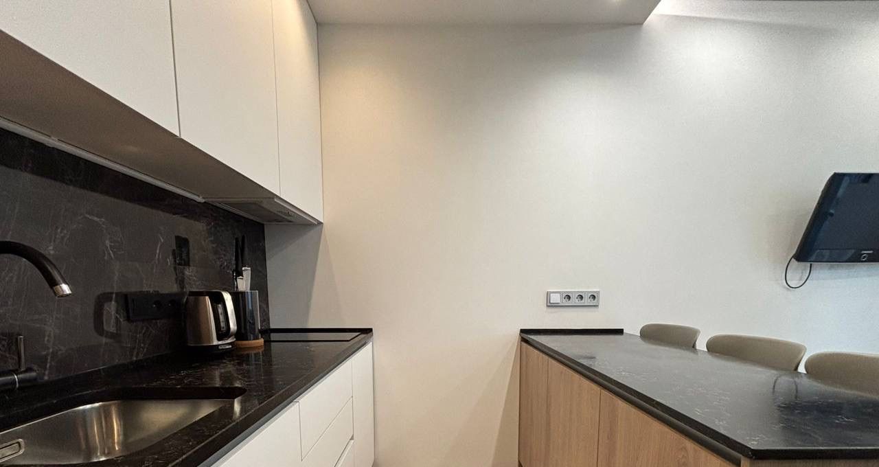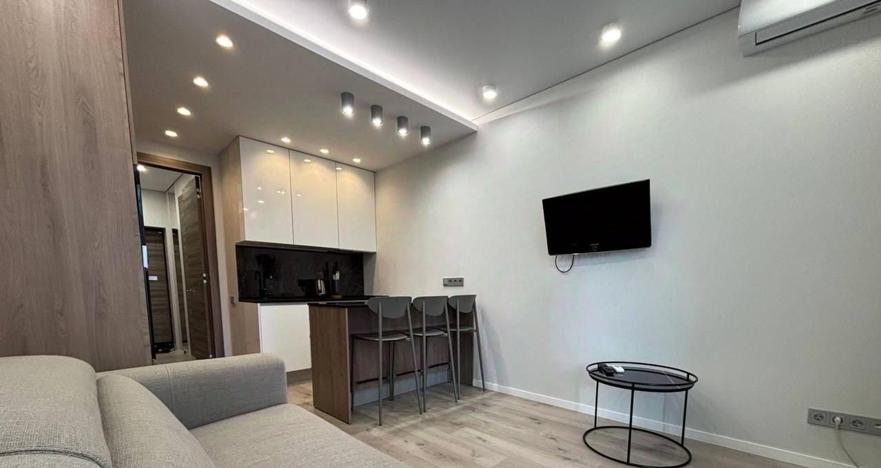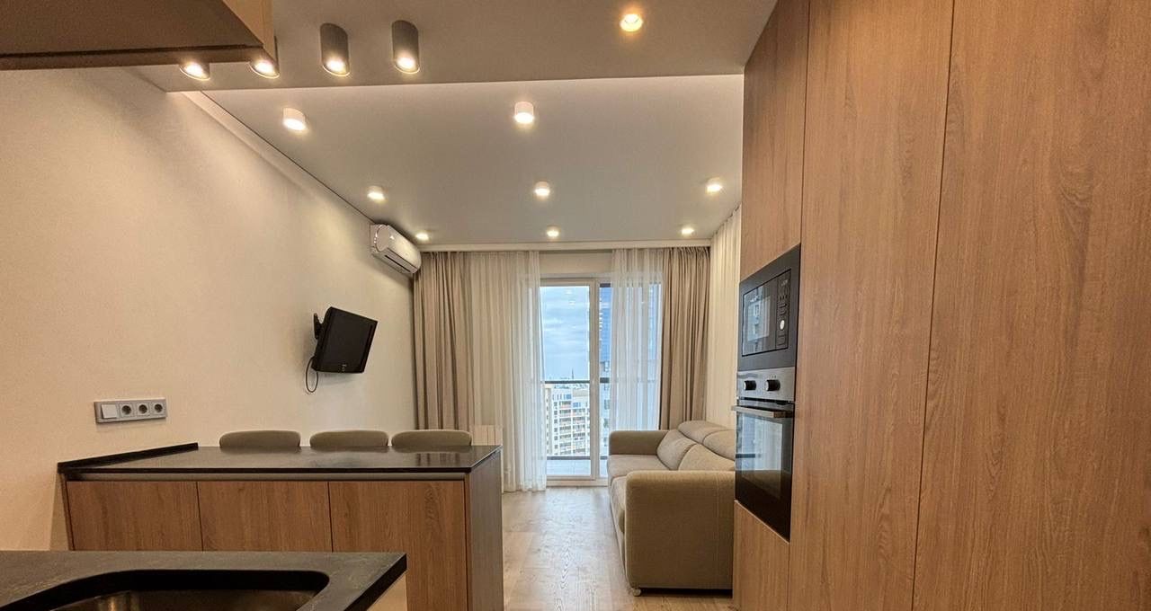 Квартира привлекает дизайнерским ремонтом и продуманной обстановкой. В комнате есть необходимая мебель для комфортного проживания. Кухня площадью 8 кв. м оборудована всей необходимой техникой: холодильник, посудомоечная машина и стиральная машина. В гостиной зоне установлен телевизор. Санузел совмещенный и оснащен ванной, что делает использование пространства особенно удобным.