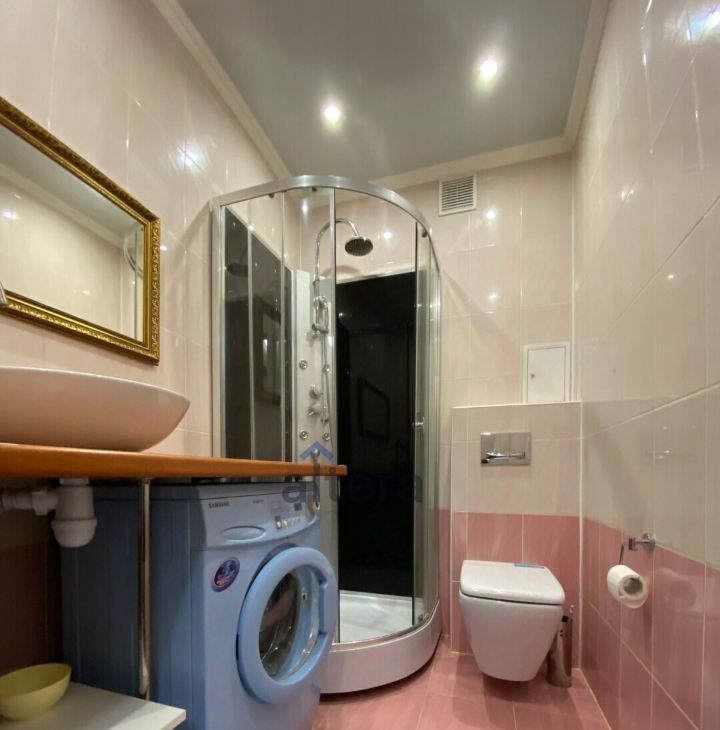 Это просторная светлая студия с ремонтом в хорошем доме. В квартире есть всё необходимое: большая двуспальная кровать, диван, стиральная машина, телевизор и вместительный шкаф.