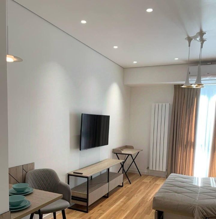 В квартире выполнен дизайнерский ремонт, который подчеркивает её уникальность и стиль. Пространство грамотно организовано: в комнате есть вся необходимая мебель, а в кухонной зоне установлена современная техника, включая кондиционер, холодильник, телевизор и стиральную машину. В совмещенном санузле установлена ванна, что позволит вам расслабиться после насыщенного дня.