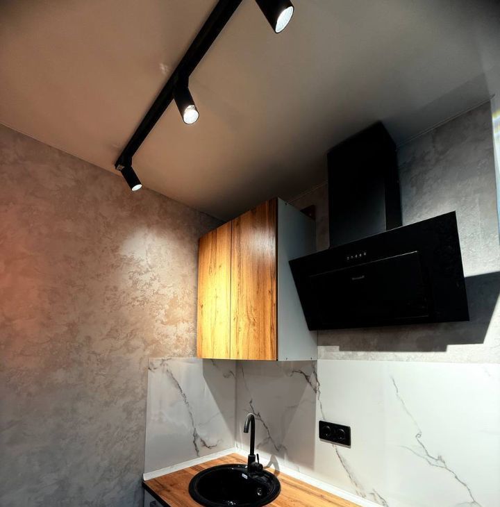 Кухонная зона: Современная варочная панель (безопасное электричество, без газа), холодильник, вся необходимая мебель для хранения.