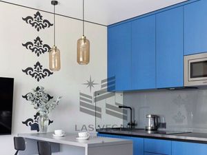 Полностью оборудованную кухню: чайник, плита, духовой шкаф, холодильник , микроволновая печь и всё необходимое для готовки.