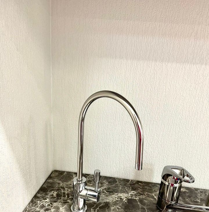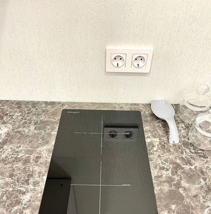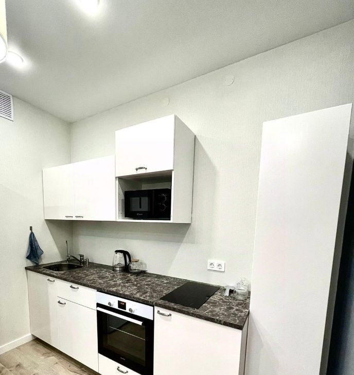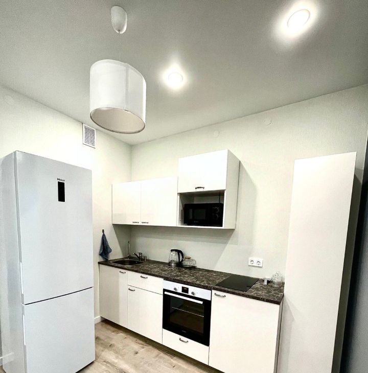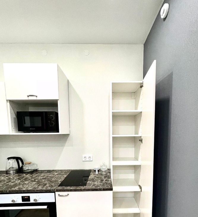 Стильный кухонный гарнитур, оснащён варочной панелью, духовым шкафом, а также имеется микроволновая печь, электрический чайник, посуда, дополнительно установлен кран с фильтрованной водой, стиральная машина и двухкамерный холодильник;