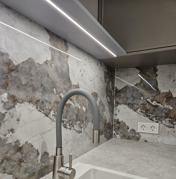 кухня до потолка со встроенной индукционной плитой. Подготовлены шкафы для духовки, ПММ, встроенного холодильника.Удобная врезная подсветка от взмаха руки (Италия). Фурнитура Hettich (Германия). Красивые фасады в тонкой рамке+ 3d волна. Удобный смеситель с гибким изливом.