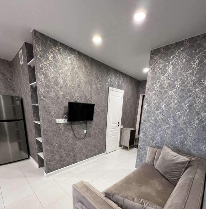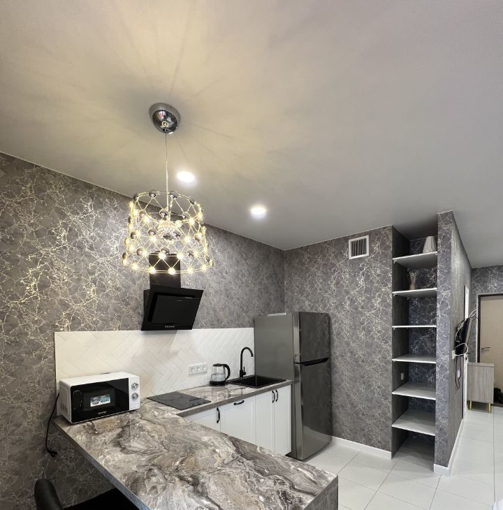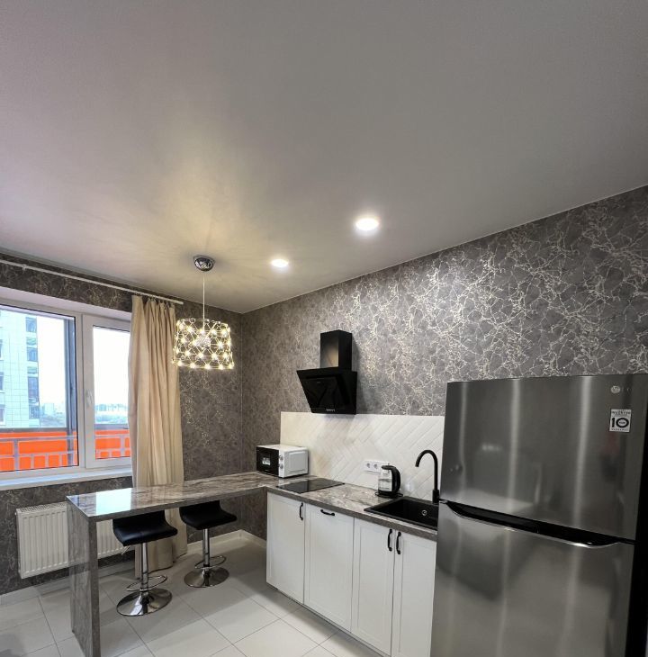 Полноценная куxня с обеденной зоной,с эл.плитой и вытяжкой, посудомоечной машиной,холодильником ,свч(микроволновая печь). Также имеется эл.чайник,пароотпариватель, беспроводной пылесос.