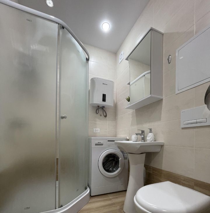 Кухонная зона компактная, но функциональная, с необходимой бытовой техникой. Совмещенный санузел выполнен в светлых тонах и оснащен душевой кабиной. Дом кирпичный, что гарантирует хорошую тепло- и звукоизоляцию.