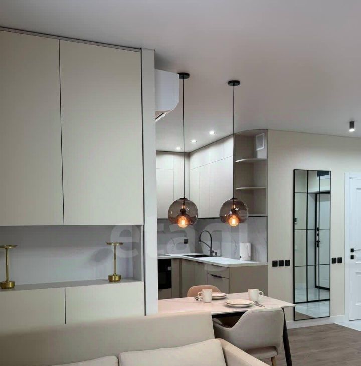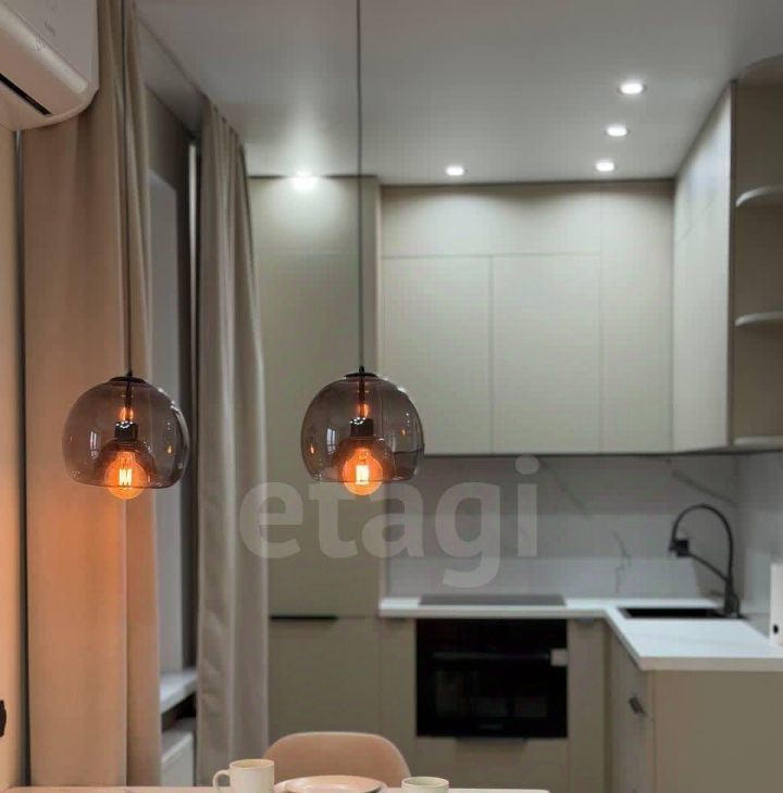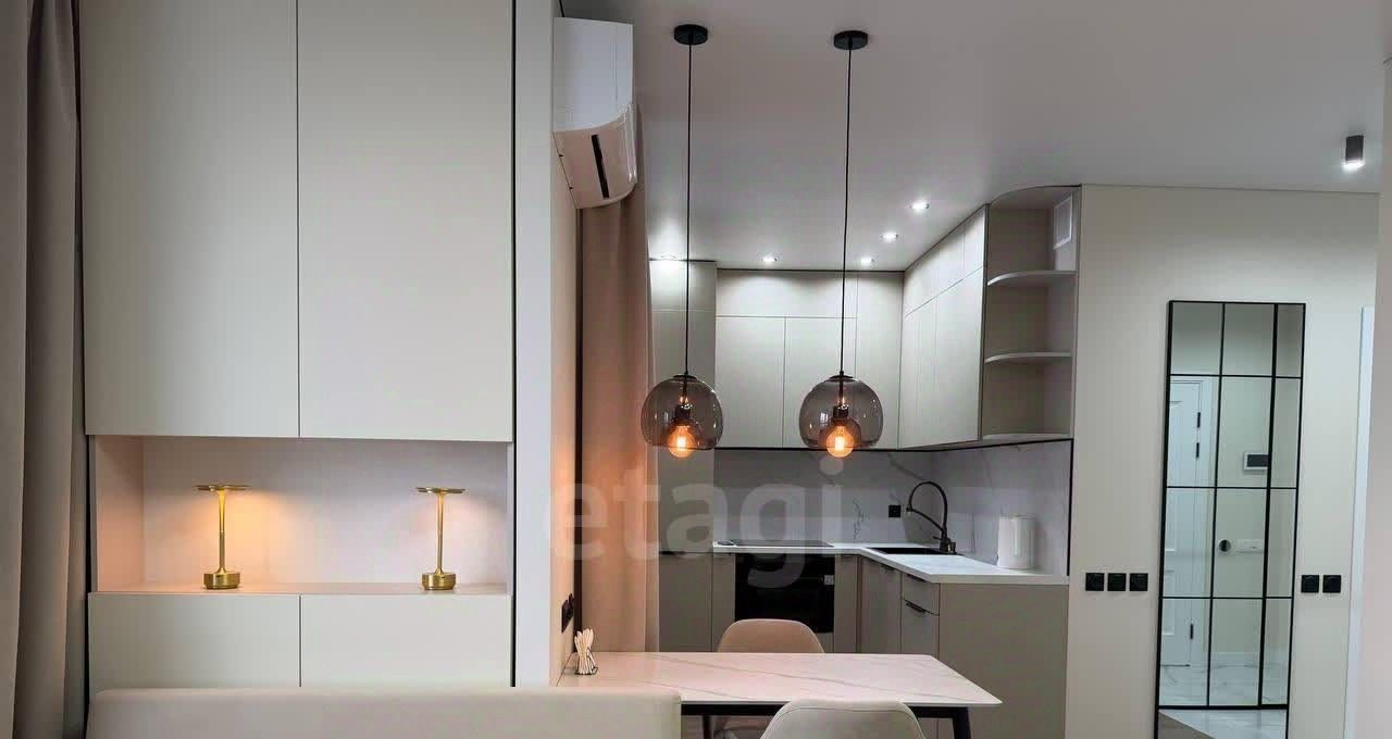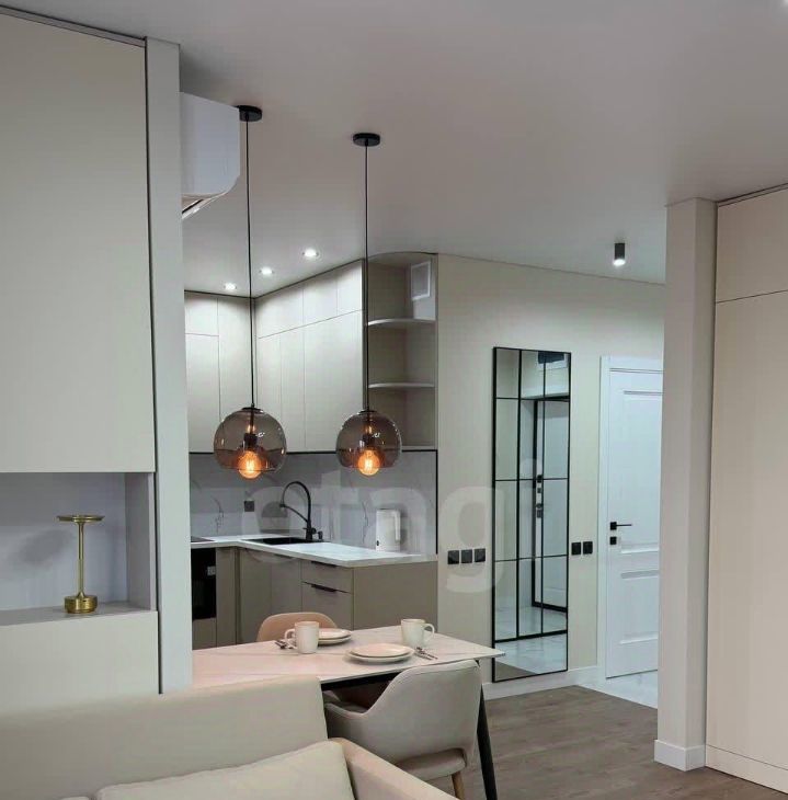 Оснащена современными удобствами: кондиционер, духовой шкаф, вытяжка и так далее.