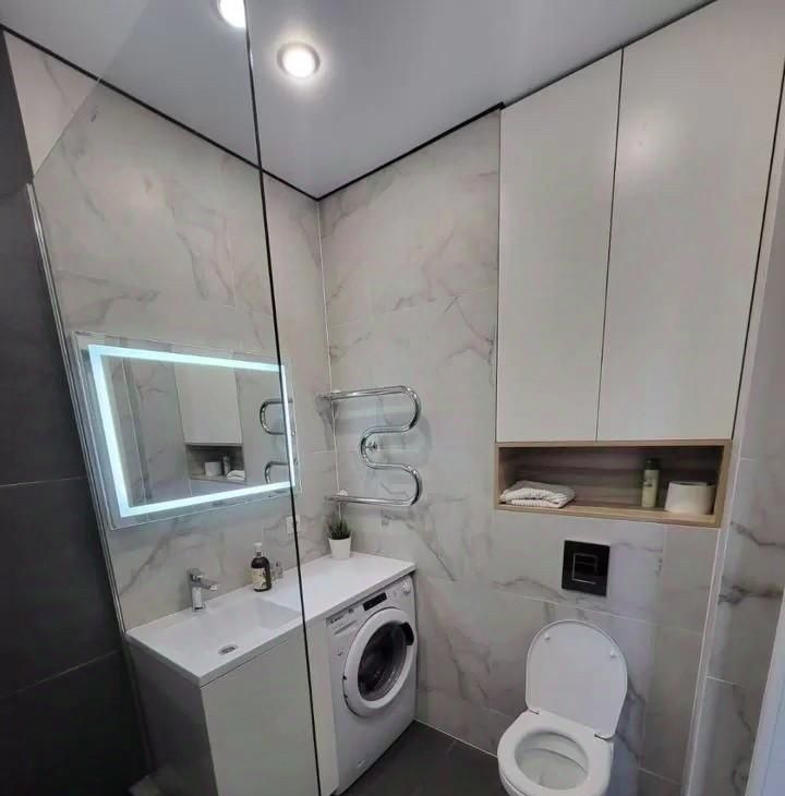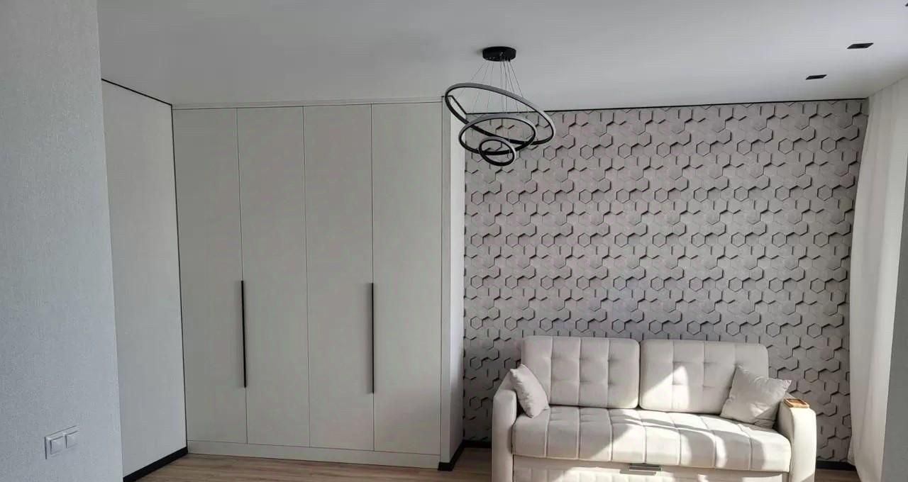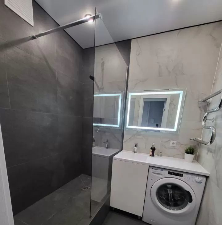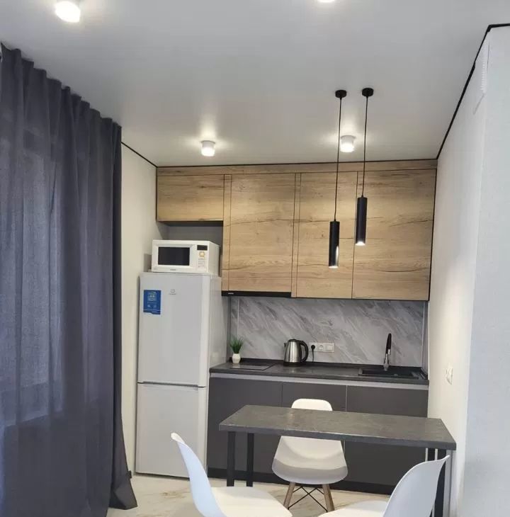 В квартире сделан качественный евроремонт. Пространство студии удобно организовано: есть зона для отдыха и работы. На кухне и в комнате установлена современная мебель, поэтому вам не нужно беспокоиться о дополнительных тратах на обстановку. Из техники доступны холодильник и стиральная машина. Санузел совмещённый, оборудован душевой кабиной.