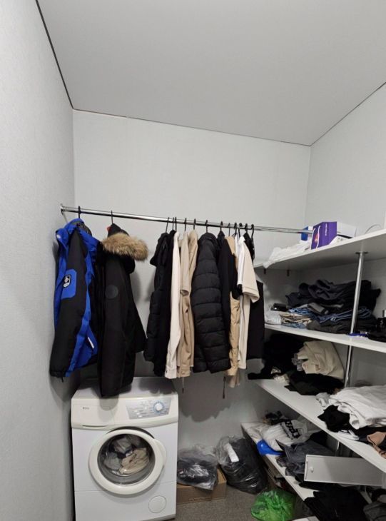 Кухонный гарнитур, холодильник , микроволновая печь, телевизор, 2 спальных места, стиральная машина, стол, стулья.
