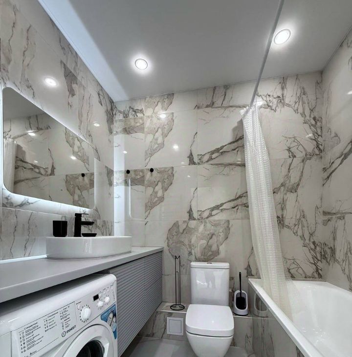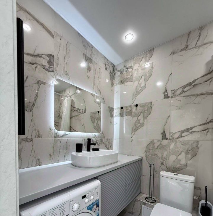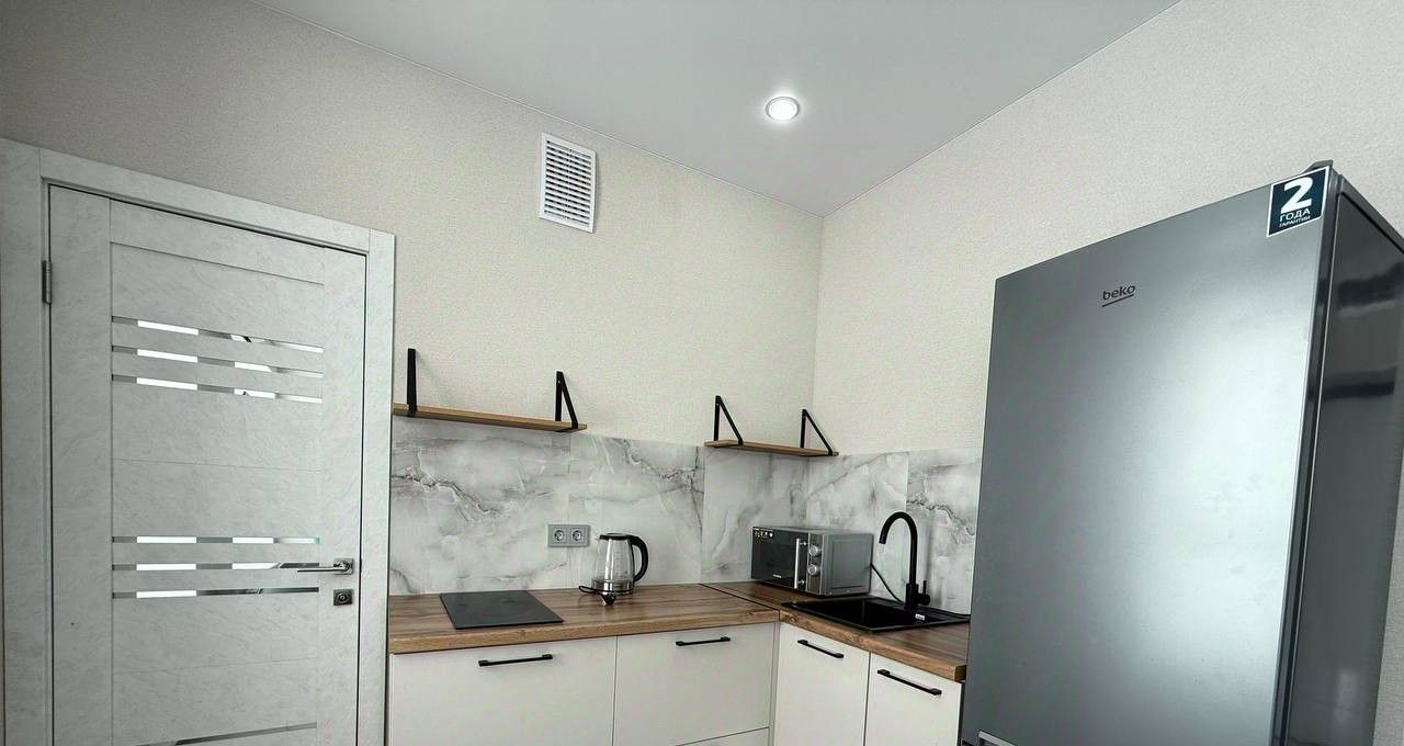 Стильный кухонный гарнитур, оснащён электрической варочной панелью, вытяжкой, а также имеется микроволновая печь, электрический чайник, стиральная машина и двухкамерный холодильник;